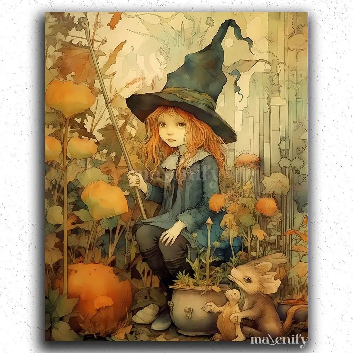 This heartwarming painting captures a young witch sitting among pumpkins and blooming flowers, accompanied by a small magical creature. The soft autumn tones and delicate details make it a cozy and enchanting piece, celebrating both nature and fantasy. Perfect for those who want to bring gentle magic into their Halloween décor.