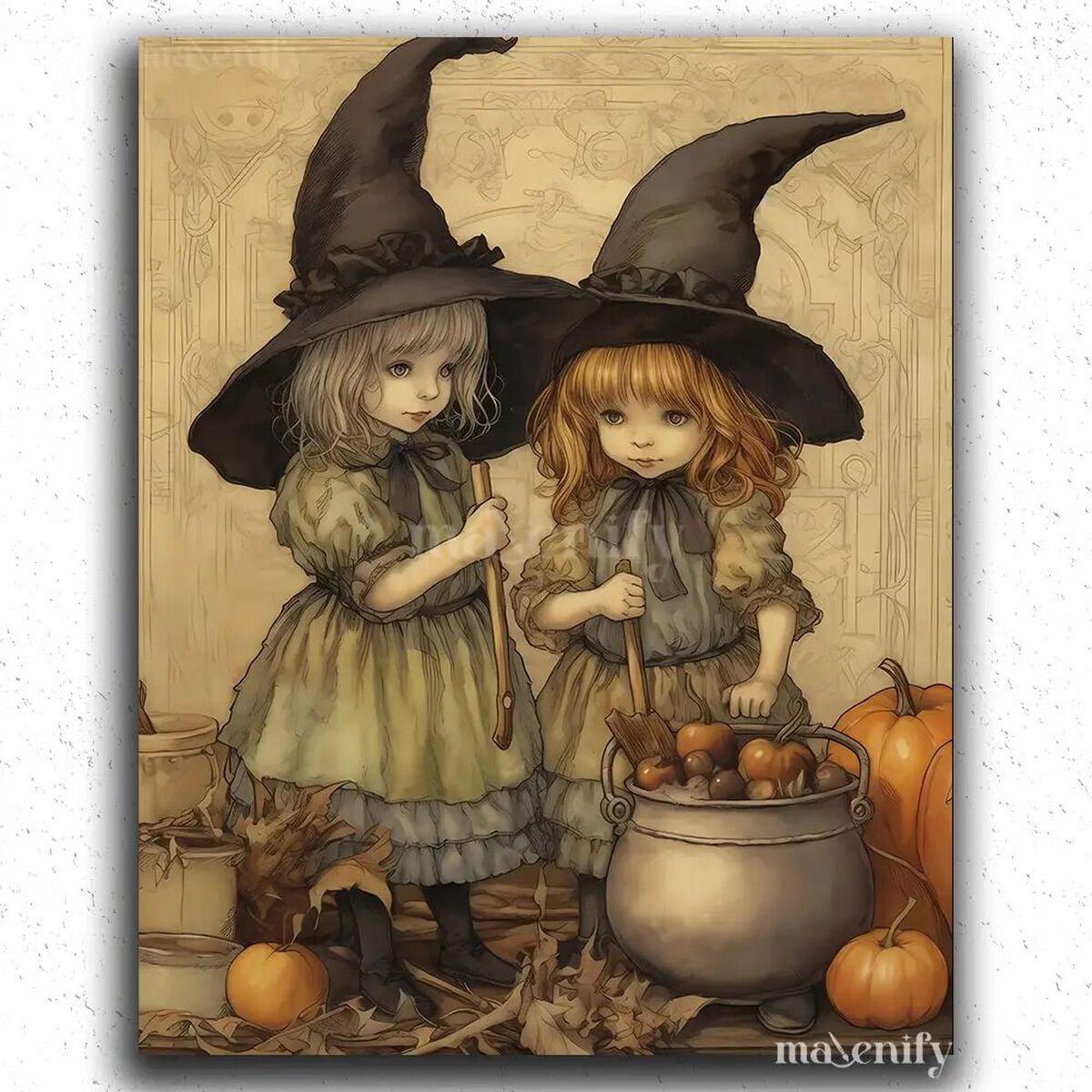 This enchanting artwork depicts two young witches in vintage dresses and pointed hats, carefully stirring a cauldron filled with magical ingredients. Surrounded by pumpkins and autumn leaves, it radiates a whimsical storybook charm. Perfect for creating a soft, nostalgic, and magical Halloween vibe in your home.