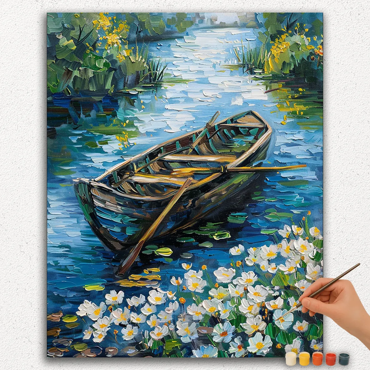 Transform your space with our “Beautiful Boat and White Flowers” DIY painting kit. This serene scene features a peaceful boat floating on calm waters, surrounded by delicate white flowers.