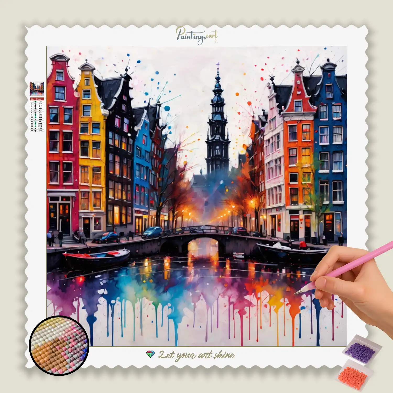 Experience the pulsating heart of the Netherlands with our vibrant Diamond Painting “Amsterdam in Colors”! This radiant motif captures the unique beauty of Amsterdam, where historic gabled houses and idyllic canals glow in a kaleidoscope of colors. Every glittering stone helps you bring the city’s lively atmosphere, charming bridges, and colorful facades to life. It’s a tribute to the picturesque architecture, artistic soul, and cosmopolitan culture of this fascinating metropolis. An ideal Diamond Painting for anyone who loves European flair and wants to bring a touch of urban splendor into their home.