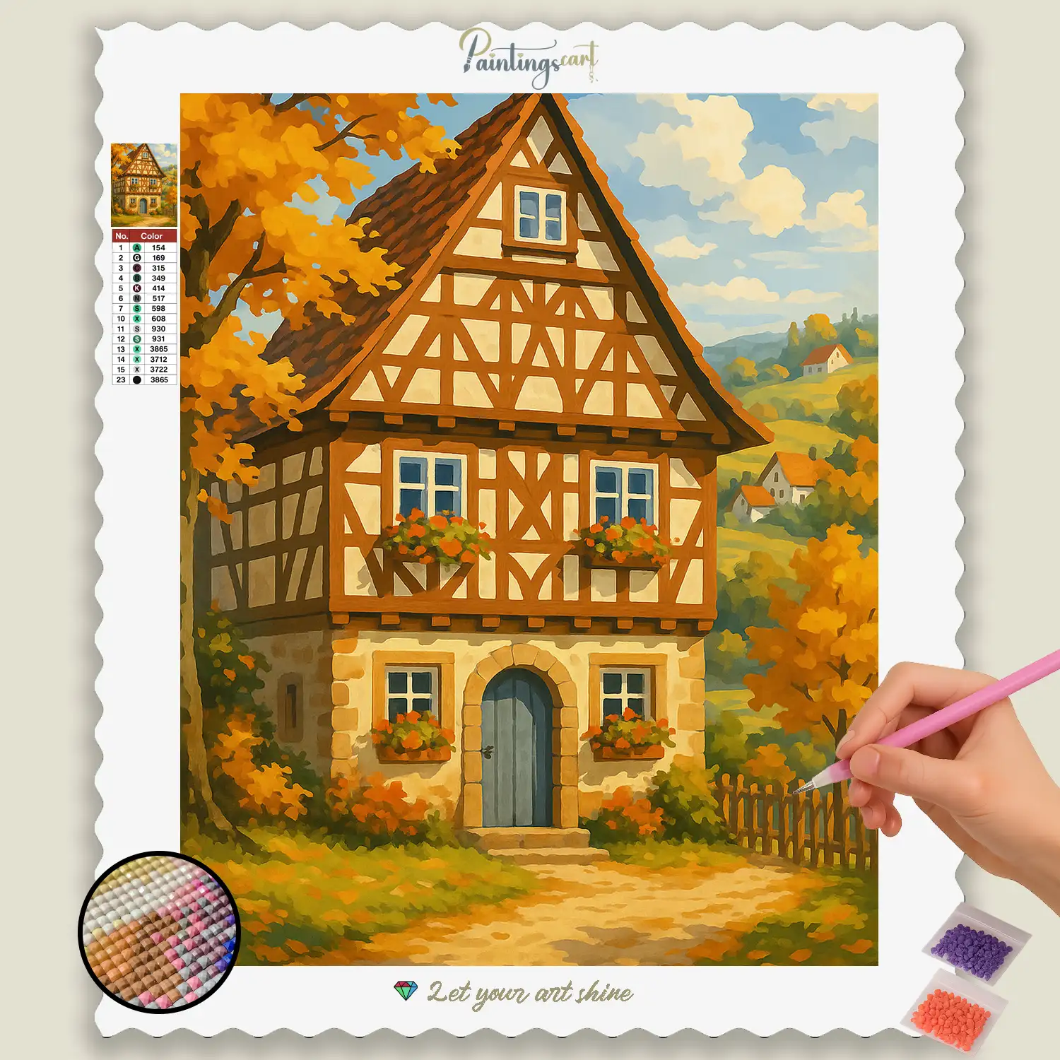 Bring the picturesque romance of country life into your home with our enchanting Diamond Painting “Autumn Village with Half-Timbered Houses”! This idyllic motif captures the timeless beauty of a charming village, where traditional half-timbered houses stand amidst the warm, glowing colors of autumn. Every sparkling stone helps you bring to life the rustic details of the houses, the golden tree crowns, and the peaceful, inviting atmosphere of the rural landscape. It’s a tribute to coziness, to the simple beauty of nature, and to the nostalgia evoked by such traditional scenes. An ideal Diamond Painting for anyone who loves country life, yearns for peace, and wants to bring a touch of rural magic into their home.