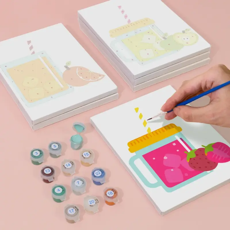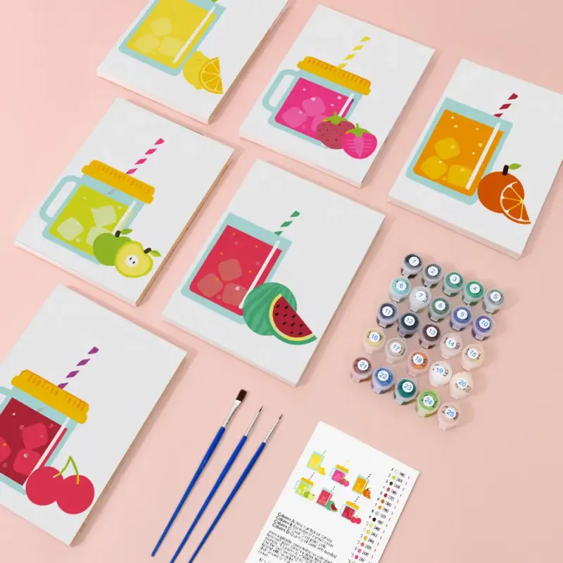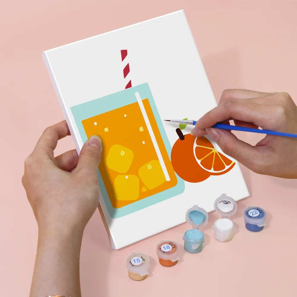 The “Citrus Drinks” Mini Paint by Numbers set brings sparkling freshness and bright colors to your canvas. Whether limes, lemons, or oranges – this fruity motif exudes pure summer energy and creative lightness. Ideal for hot days, creative breaks, or as a cheerful DIY gift. The set contains a pre-printed mini canvas, vibrant acrylic paints, and a brush – perfect for beginners, children, and anyone who likes it fresh.