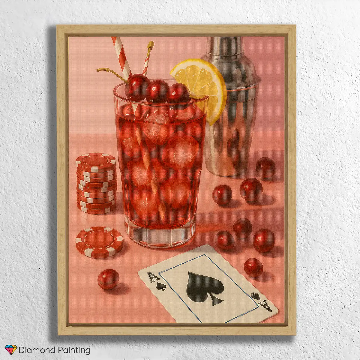 Create a sparkling masterpiece that enlivens the spirit and conjures an aura of sophistication and entertainment. This high-quality Diamond Painting Set offers not only a wonderfully relaxing and engaging crafting experience but also a stunning result that you can proudly display in your bar, game room, or living room. Whether as a charming focal point, an inspiring addition to your collection, or a perfect gift for gamers, cocktail aficionados, and anyone who appreciates the stylish facets of life – this Diamond Painting artwork is a fabulous way to capture the allure of Cranberry Cocktail and Poker Charm in a shimmering work of art.