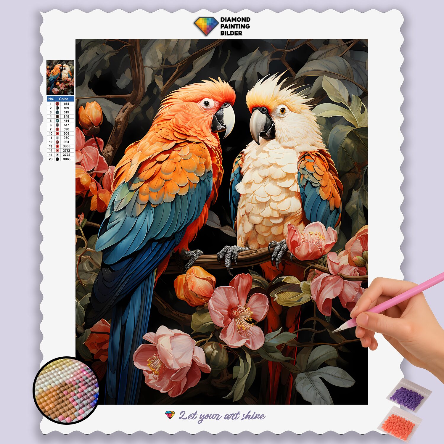 Celebrate love in tropical splendor with our enchanting Diamond Painting “Cute Parrot Couple”! This heartwarming motif captures the affectionate bond of two parrots leaning towards each other with their vibrant feathers or sitting together on a branch. Each glittering stone helps you bring their dazzling colors, expressive eyes, and the aura of affection and harmony to life. It is a tribute to the beauty of wildlife, the endless joy of love, and the vibrant splendor of tropical nature. An ideal Diamond Painting for all animal lovers who long for warmth and a touch of exotic charm in their home.