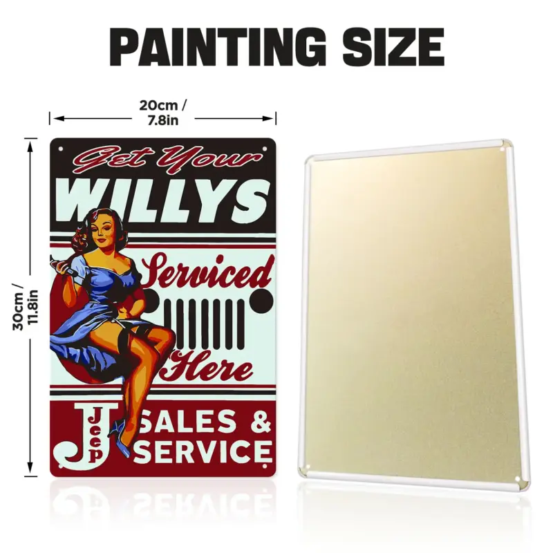 Add a touch of vintage charm to your home or bar with the Get Your Willys Serviced Here DIY metal poster. This unique piece measures 20x30cm or 7.8×11.8 inches and features rounded corners for a sleek finish. The vintage design makes it a perfect addition for those who love classic themes. It’s an excellent way to personalize your space with a nostalgic feel.