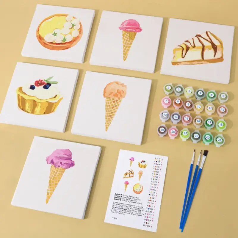 The “Ice Cream” Mini Paint-by-Numbers set brings summery freshness and sweet fun to the canvas. Whether in a cone, in a cup, or with colorful toppings – the vibrant ice cream designs instantly put you in a good mood. Perfect for creative breaks, children, or as an original DIY gift. The pre-printed mini canvas, bright acrylic paints, and brush ensure a relaxed painting experience full of color and joy.