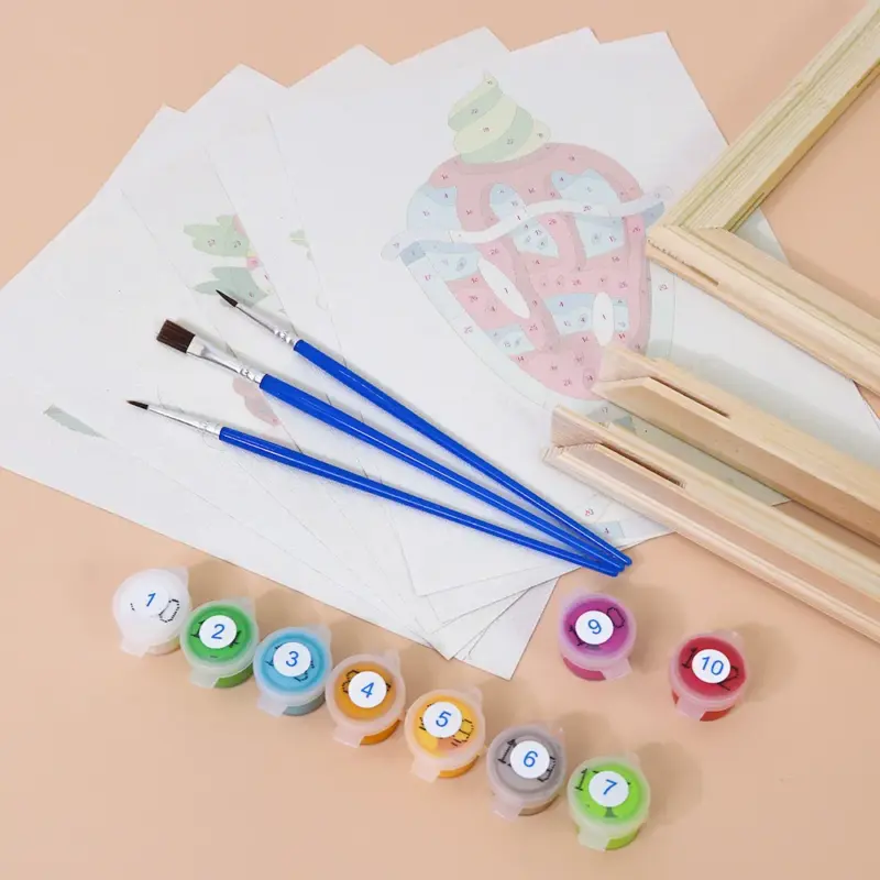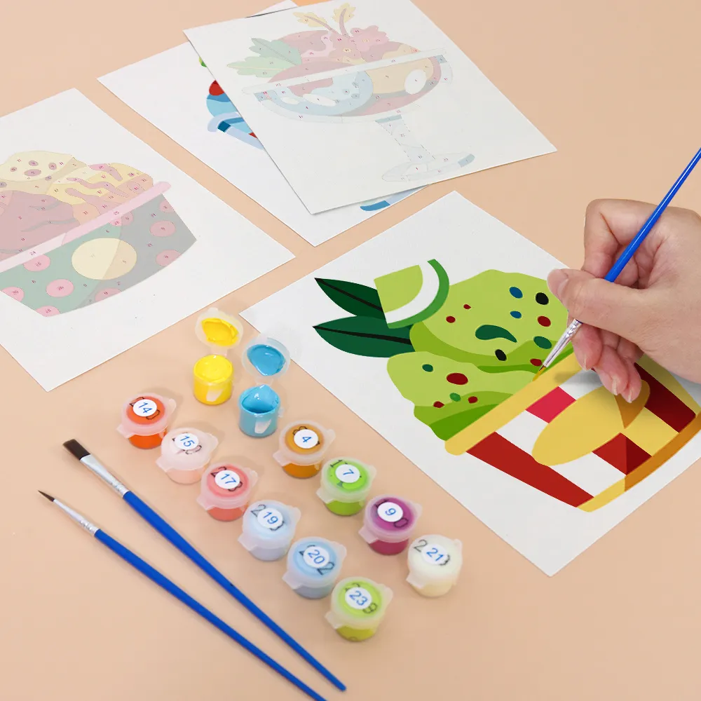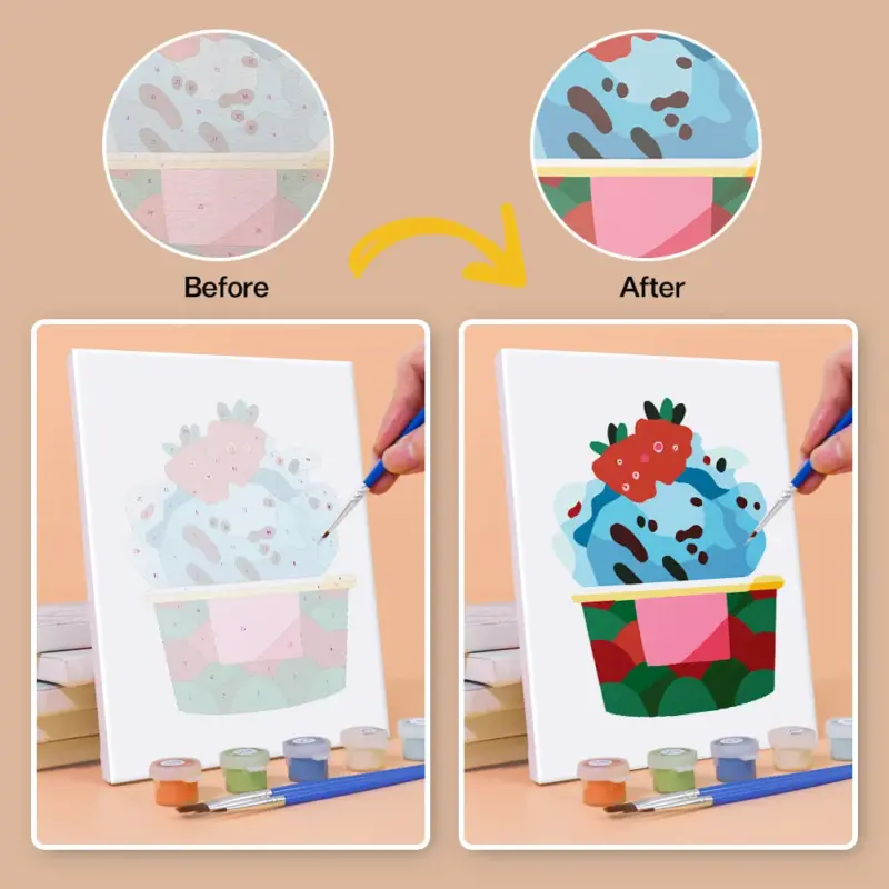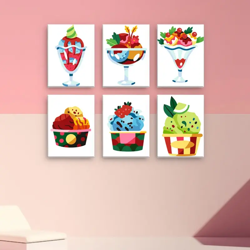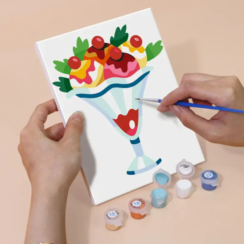 The “Icy Desserts” Mini Paint-by-Numbers set brings a sweet refreshment to the canvas. Whether ice cream, sorbet, or colorful dessert cups – this motif combines enjoyment with creative ease and a summery mood. Perfect for children, beginners, or as a small gift for those with a sweet tooth. The pre-printed mini canvas, the vibrant acrylic paints, and the matching brush ensure uncomplicated painting fun full of color and sweetness.