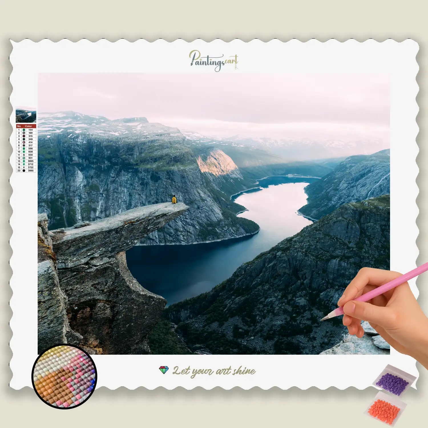Discover a hidden oasis of tranquility with our majestic Diamond Painting “Lake Amidst the Mountains”! This breathtaking motif captures the pristine beauty of a crystal-clear lake, peacefully nestled in the heart of majestic mountains. Each glittering stone helps you bring to life the reflection of the sky on the water’s surface, the rugged peaks, and the infinite expanse of the alpine landscape. It’s a tribute to pure, untamed nature and the profound silence that prevails in such secluded places. An ideal Diamond Painting for anyone yearning for absolute peace, breathtaking natural beauty, and a respite from the hustle and bustle.