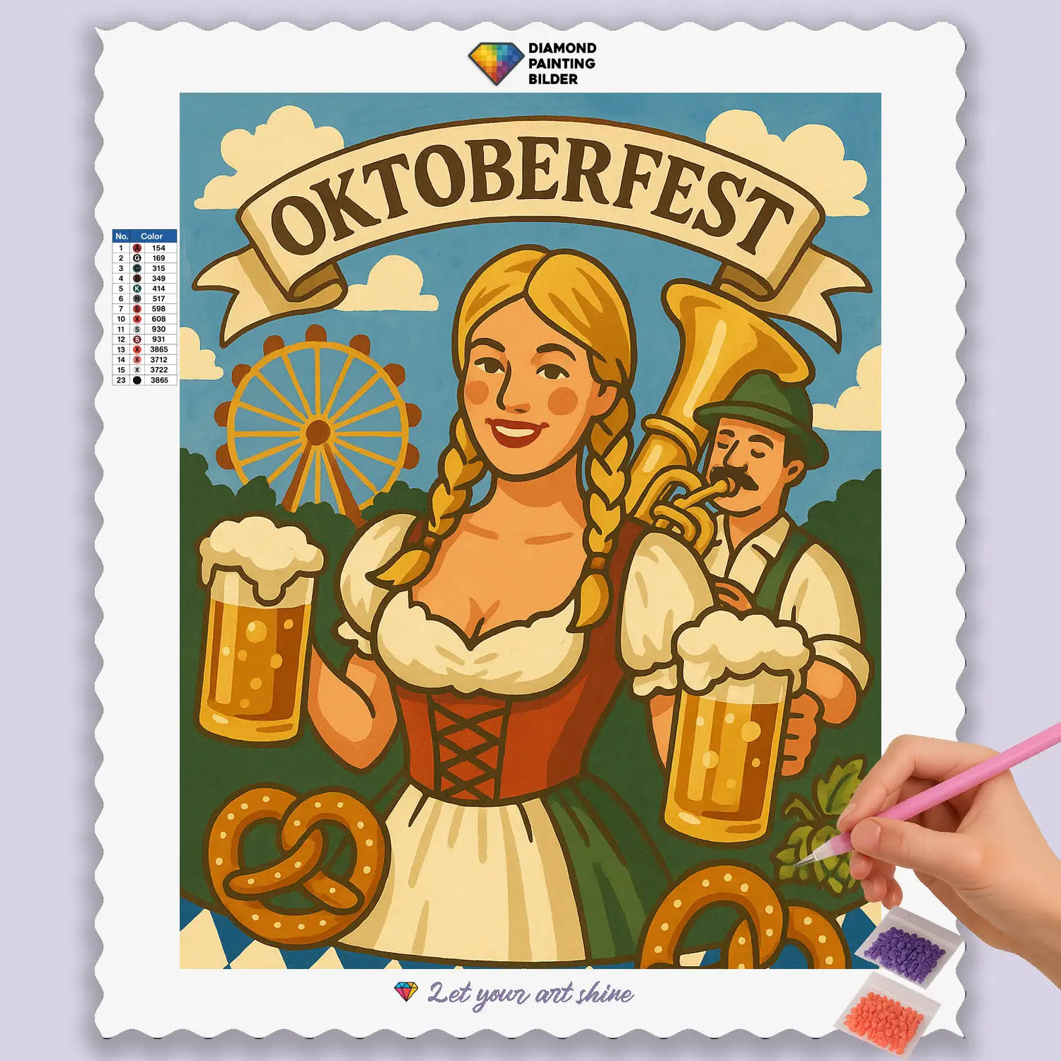 Immerse yourself in the exuberant world of the largest folk festival with our vibrant Diamond Painting “Oktoberfest Celebration in Bavarian Style”! This dynamic motif captures the warm atmosphere of Oktoberfest, with dirndls, lederhosen, giant beer steins, and unmistakable Bavarian cheer. Imagine the colorful tents, festive music, and smiling faces of visitors toasting together. Each sparkling gem helps you create the vibrant colors of traditional clothing, the frothy beers, and the infectious joie de vivre radiated by this Bavarian celebration. It’s a tribute to German hospitality, convivial moments, and the enduring beauty of traditional festivals.
