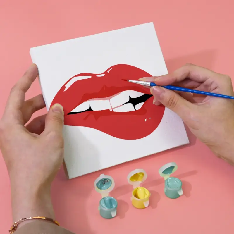 The “Pink Lips” mini paint-by-numbers set is a stylish motif with a modern flair. The sensual lips in vibrant pink represent confidence, elegance, and pop art flair – perfect for creative personalities with style. Ideal for beauty lovers, decor enthusiasts, or as a trendy gift. With a pre-printed mini canvas, vibrant acrylic paints, and a matching brush, the artwork is easy to create – even for beginners.