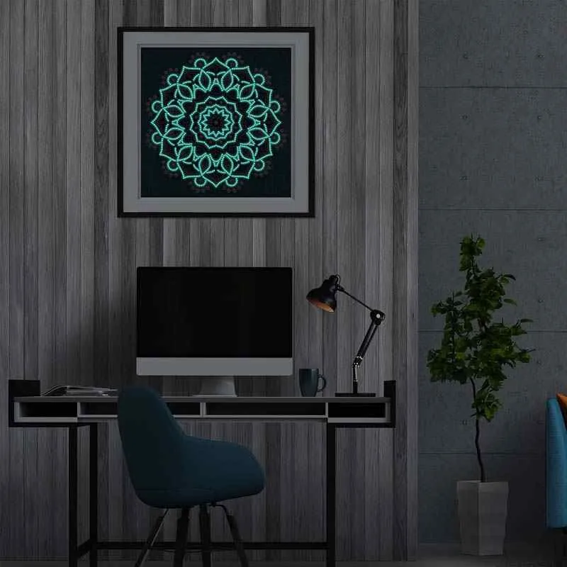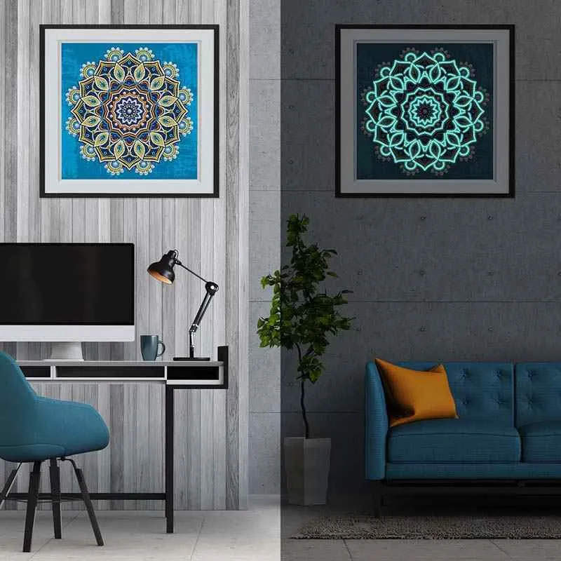 Discover timeless beauty that shines by day and night! Our “Elegant Glow Mandala” is a work of art that combines harmonious design with a touch of magic. During the day, this motif captivates with its delicate lines and graceful symmetry. But the true wonder reveals itself in the dark: specially embedded glow stones emit a soft, ethereal shimmer that traces the elegant patterns and creates an atmosphere of deep tranquility and beauty.