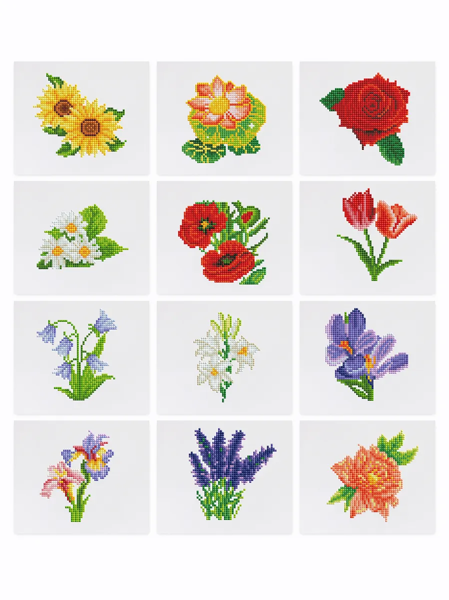 Pick your own everlasting bouquet! With our 12-piece “Sparkling Bouquet” set from the Mini Diamond Paintings collection, you can create twelve different, colorful flowers. This package is a true feast for the senses and includes a diverse selection of blooms – from the classic rose to the cheerful gerbera and the elegant lily. Each of the twelve motifs is a small work of art that celebrates the beauty of nature.