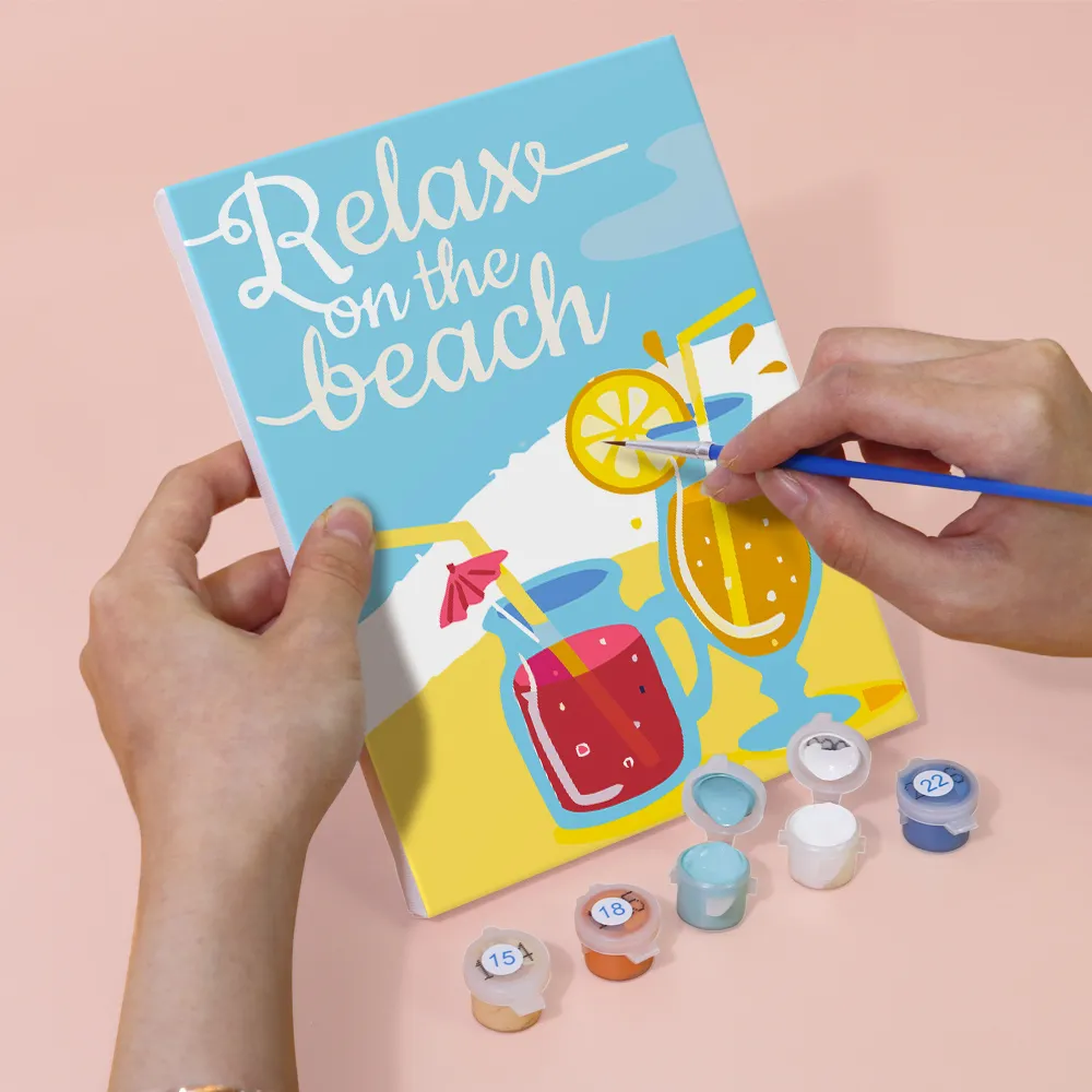 The “Summer Days” Mini Paint by Numbers set brings unforgettable sunny moments to the canvas. With elements like flip-flops, palm trees, the sun, or cool drinks, the motif exudes pure vacation feeling. Ideal for creative breaks in the summer, as a souvenir or decoration with a beachy feel. The set contains a pre-printed mini canvas, bright acrylic paints, and a brush – perfect for beginners and summer lovers.