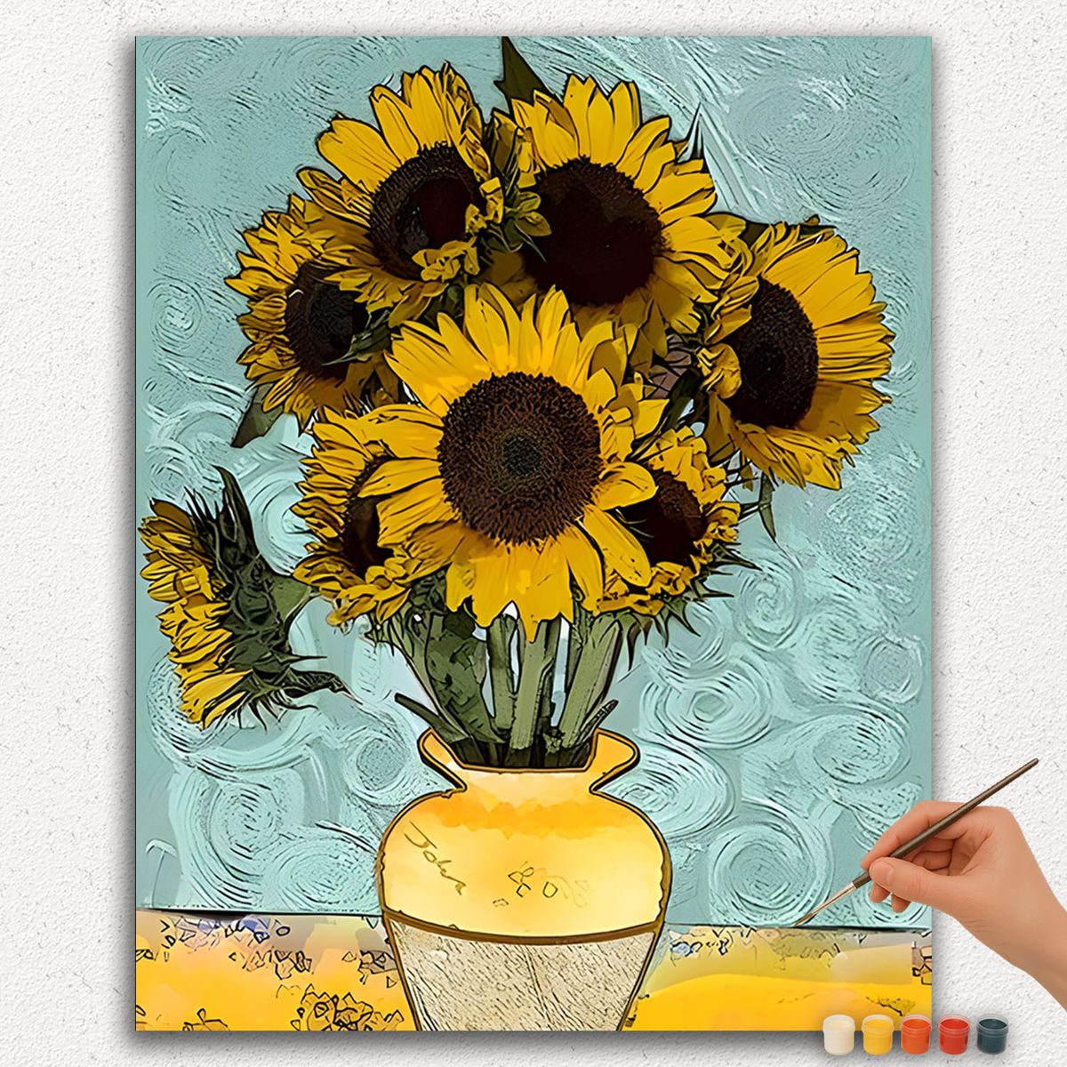 Bring the warmth of summer into your home with our Sunflowers in Vase DIY Painting Kit. This paint-by-numbers set lets you create a stunning artwork of bright yellow sunflowers arranged in a classic blue vase.