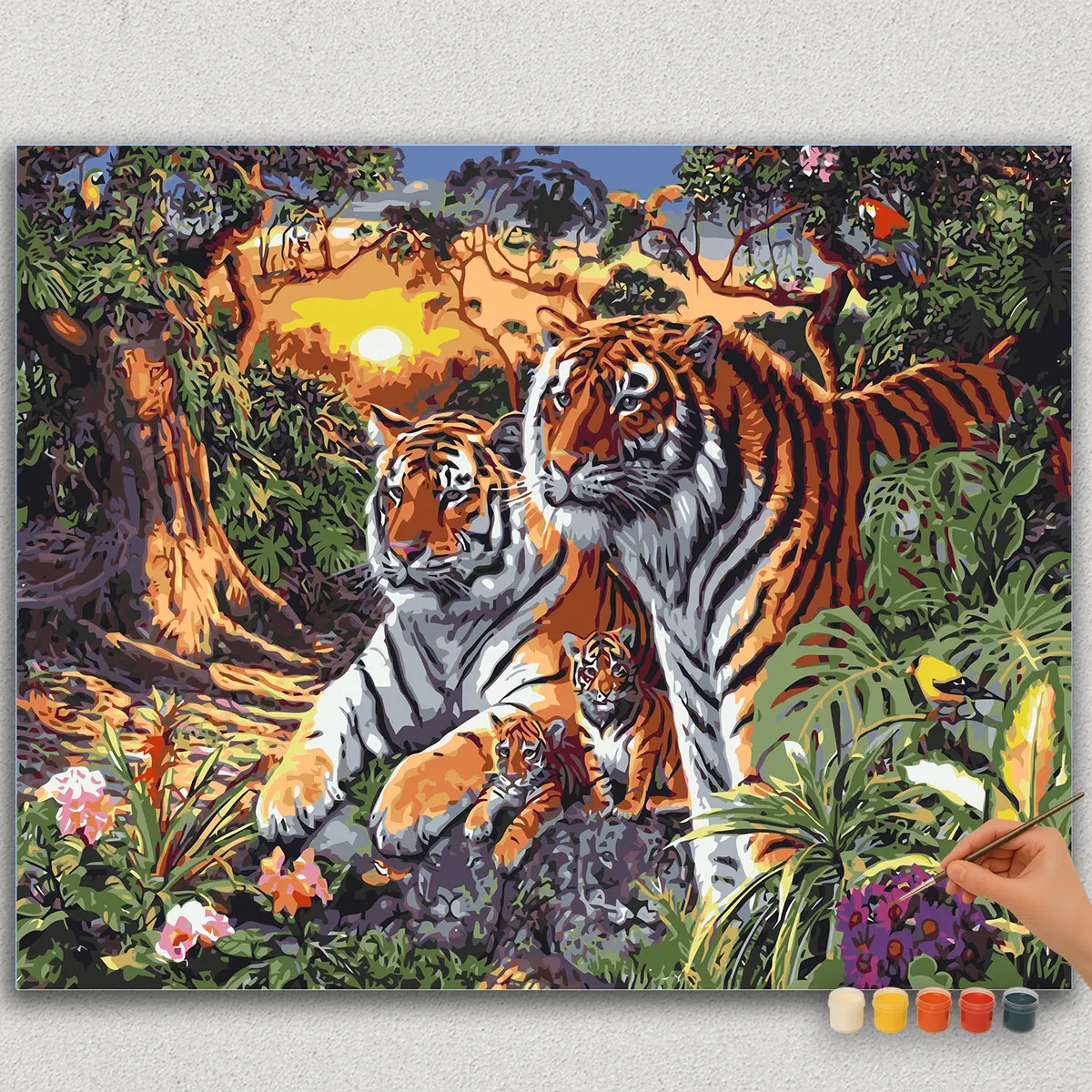 Bring the majestic tiger family to life with our DIY painting kit. This set includes everything you need to create a stunning artwork featuring a protective tiger parent with adorable cubs in their natural habitat.