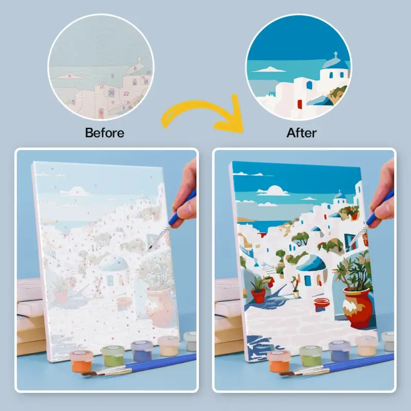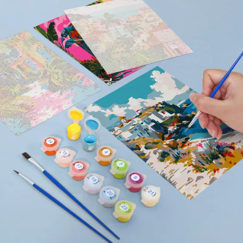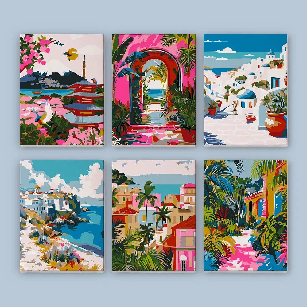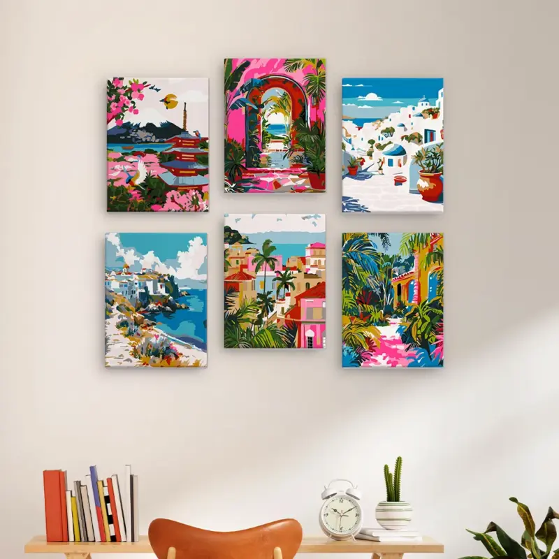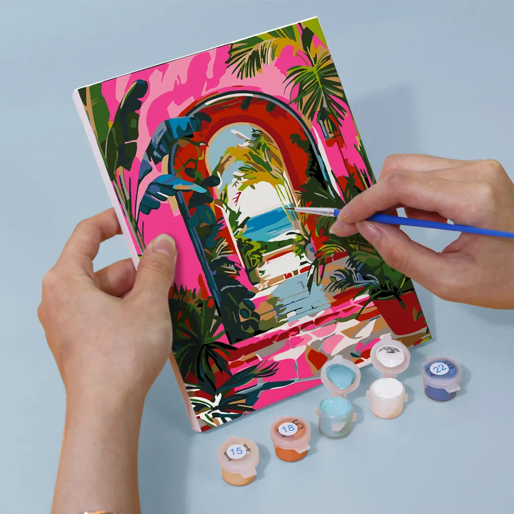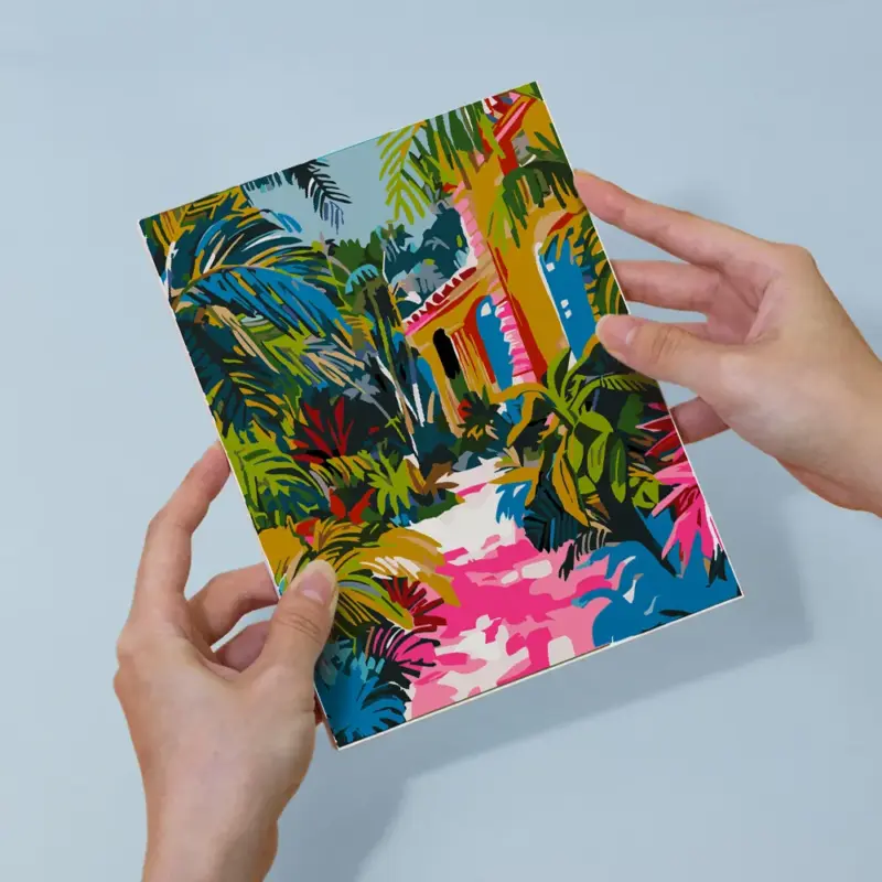 The “Tropical Horizons” Mini Paint by Numbers set transports you to distant, paradisiacal shores with palm trees, sunsets, and exotic colors. This motif brings vacation vibes and relaxation directly into your home. Ideal as a creative break, summery wall decor, or a gift for travel and beach lovers. The pre-printed mini canvas, vibrant acrylic paints, and included brush make painting easy and inspiring – also suitable for beginners.