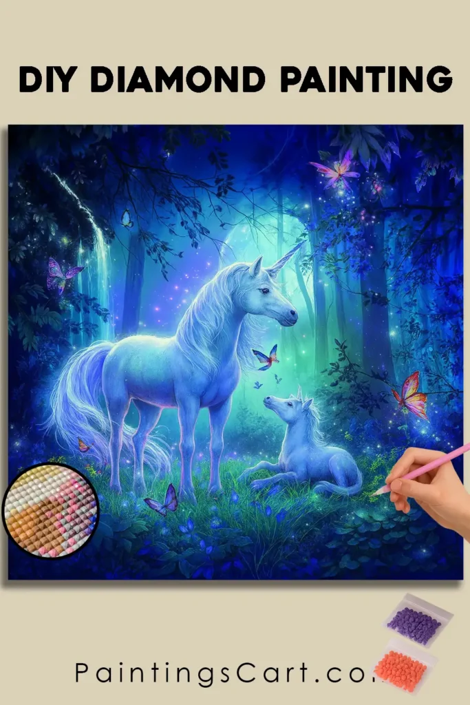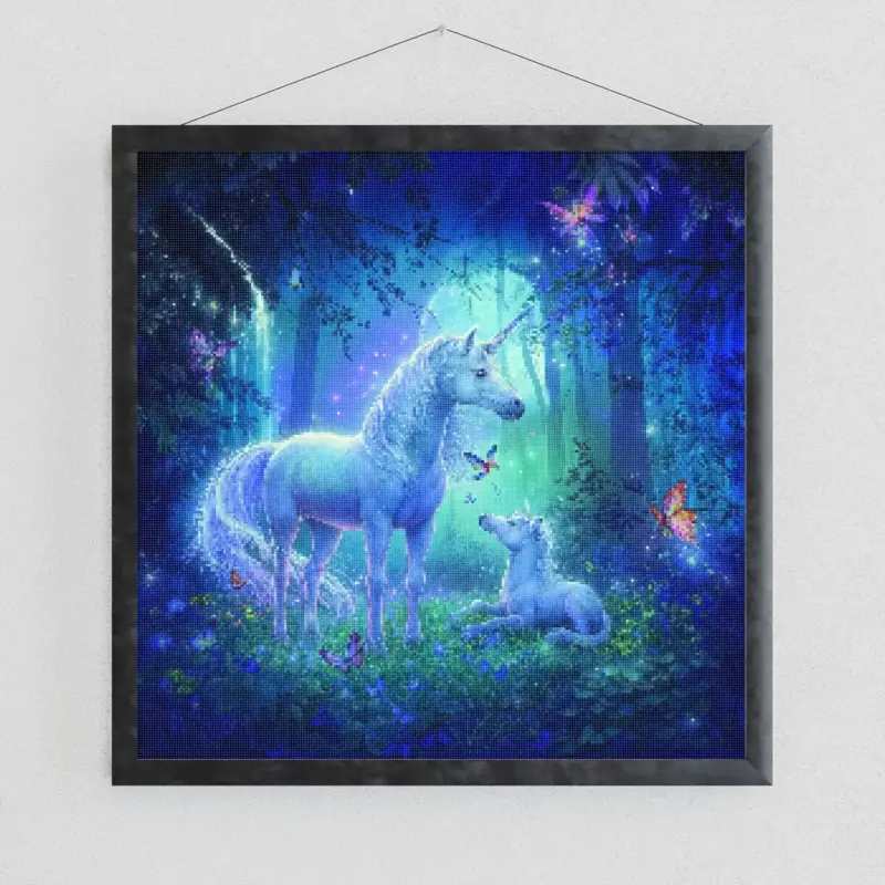 Create a radiant image that celebrates the bonds of love and the wonders of nature. This high-quality Diamond Painting Set not only offers a relaxing and captivating crafting experience but also a breathtaking result that you can proudly display. Whether as a luminous eye-catcher in any room, an imaginative addition to your collection, or as a perfect gift for dreamers and animal lovers – this Diamond Painting picture is a wonderful way to capture the grace and magic of unicorns in a unique, blue glow.
